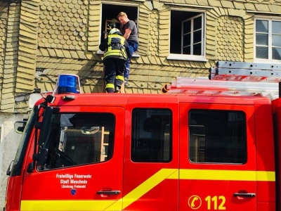 Freienohl Feuer in Mitten von Freienohl an der Hauptstraße. Rauch dringt durch ein Fenster im ersten Obergeschoss. Ein Mensch ist dort in Gefahr, schreit um Hilfe und berichtet, dass er seine Frau nicht finden kann, sie im Rauch vermisst wird. Gott sei Dank nur eine geplante Übung des Löschzuges Freienohl und Teil eines neuen Konzeptes zum Ausbau der partnerschaftlichen Zusammenarbeit mit der Löschgruppe Olpe.
