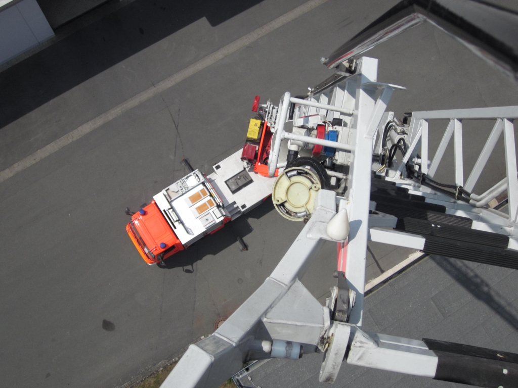 In Paderborn war unser erstes Ziel die Feuer- und Rettungswache Nord. Hier ist neben der Brandschutzdienststelle die „Technikabteilung“ untergebracht. Sie besteht aus einer Kfz-Werkstatt, LKW-Werkstatt, Hydraulikwerkstatt, Feuerlöscherwerkstatt, der Tischlerei und weiteren Einrichtungen zur Unterhaltung der feuerwehrtechnischen Geräte. Eine eigene Tankstelle und ein Desinfektionbereich für die Rettungsdienstfahrzeuge befanden sich ebenfalls auf dem Gelände der Wache Nord. Hier sahen wir neben diversen Lösch- und Rettungsfahrzeugen eine DLA (K) 23/12 auf Mercedes Benz Econic Fahrgestell. Diese verfügte über eine Hinterachszusatzlenkung, einen Leitersatz mit teleskopierbarem Gelenkarm in dem sich eine teleskopierbare Wasserleitung befand. Diese Drehleiter ist aufgrund der Hinterachszusatzlenkung sehr gut für enge Straßen und Gassen geeignet. Natürlich ließen wir uns die Chance nicht entgehen, von diesem Fahrzeug aus uns einen Blick über die Wache und in die Ferne zu genießen.