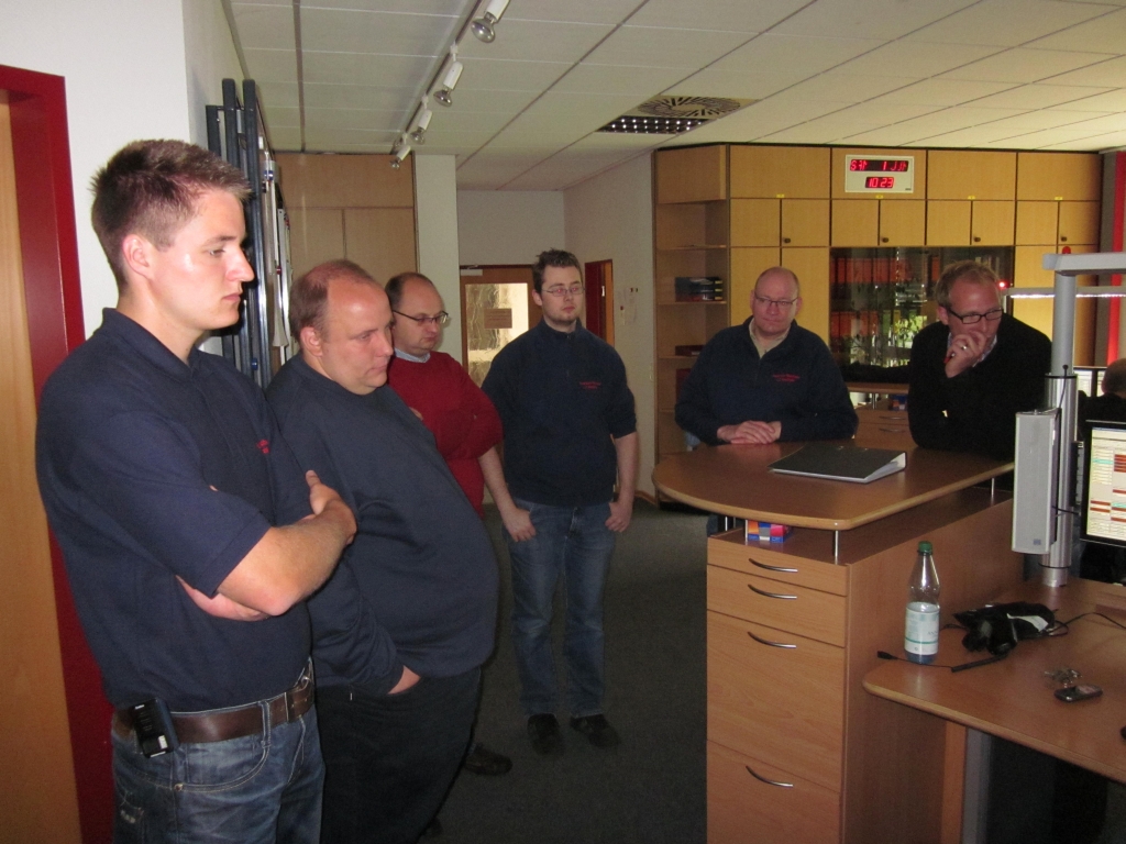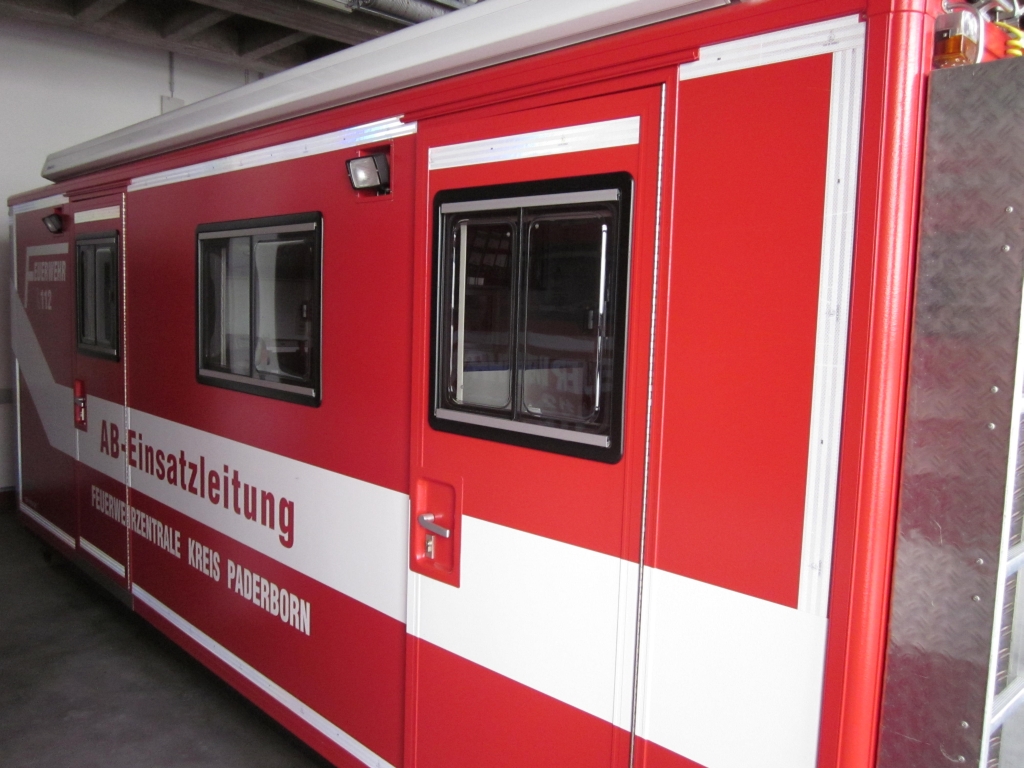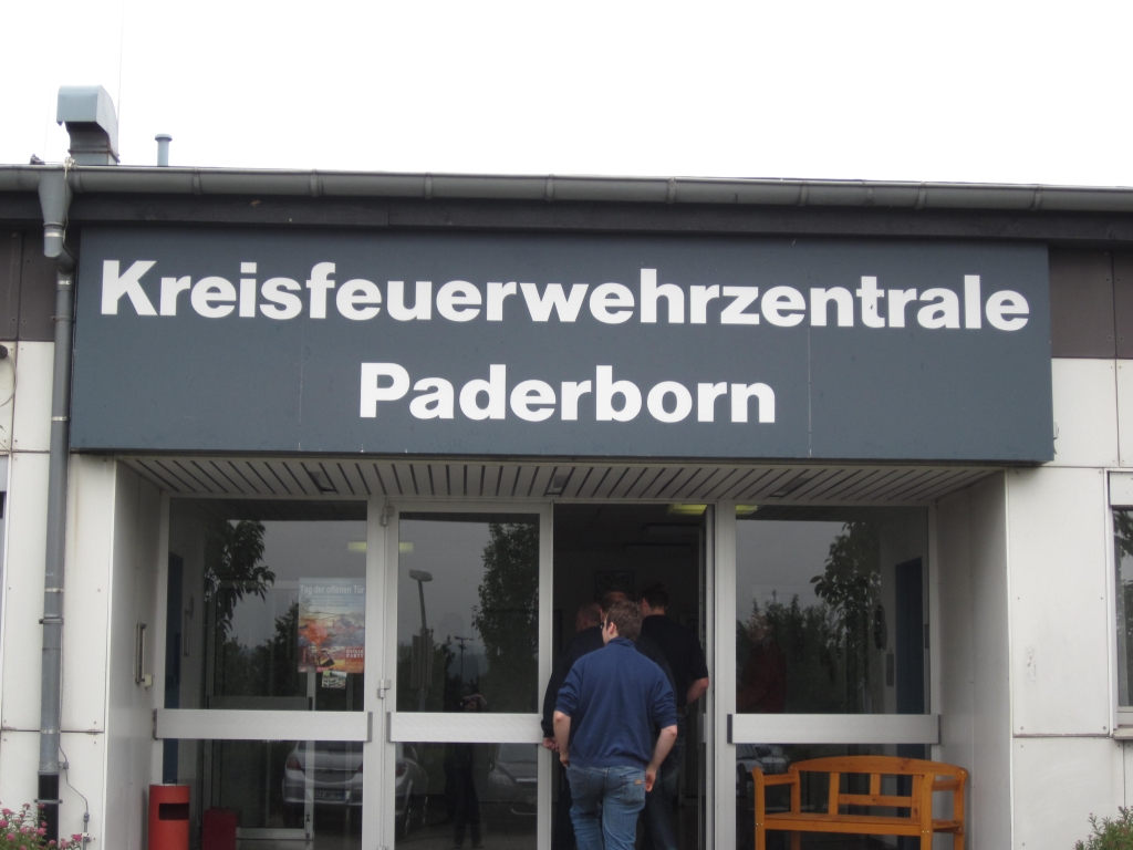 Wir fingen an der Kreisfeuerwehrzentrale am Flughafen Paderborn/Lippstadt an. Die dortige Kreisleitstelle hatte im Jahr 2010 ca. 75.000 Notrufe zu bearbeiten. 30 Notrufe können hier parallel angenommen werden. 2008 wurde die Leitstelle vom TÜV Hessen nach DIN-EN-ISO 9001 zertifiziert. Sie ist seitdem die einzigste bundesweit, bei der alle Komponenten von der Annahme des Notrufes bis hin zum Abrechnen des Einsatzes zertifiziert ist. Im Gebäude der Kreisfeuerwehrzentrale befinden sich zudem Schulungsräume, die Atemschutzwerkstatt, die Atemschutzübungsstrecke, die Schlauchpflege und mehrere Abrollbehälter (AB), wie z.B. der AB ELW 2 und AB MANV. Interessanterweise auch ein AB, ich nenne ihn mal AB „Scheißhaus“. In diesem befindet sich getrennt nach Männlein und Weiblein WC und Duschen, ideal für längere Einsätze.