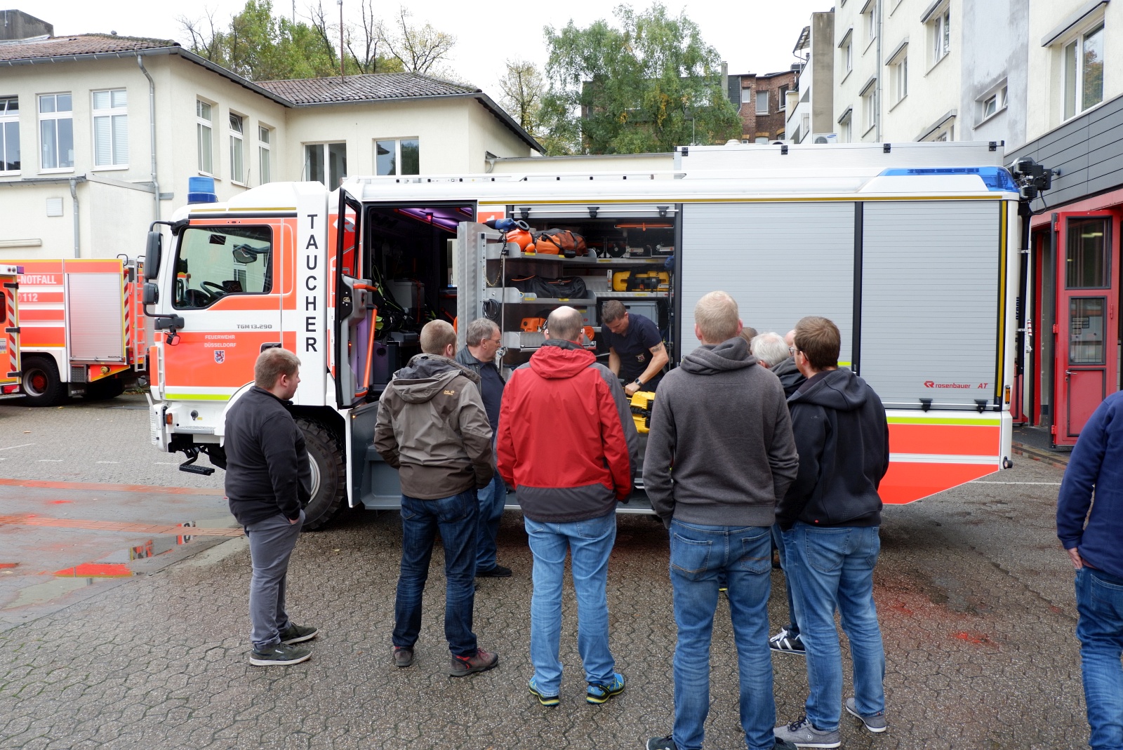 Düsseldorf. Am Samstag, den 19.10.2019 war die Funkgruppe zu einer Besichtigung bei der Feuer- und Rettungswache 1 der Berufsfeuerwehr der Landeshauptstadt Düsseldorf. Da die Funkgruppe seit vielen Jahren hervorragend mit dem DRK Meschede zusammenarbeitet, waren hier von dessen Seite natürlich auch Kameraden vertreten.