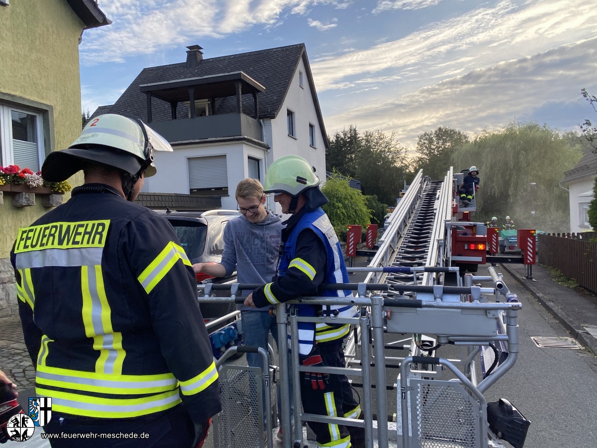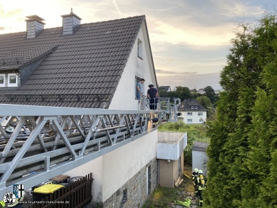 Nach der ersten Erkundung war schnell klar, dass sich die Menschenrettung schwierig gestalten würde. Das sich im Umbau befindende Einfamilienhaus steht am Ende einer Sackgasse. Kaum genug Platz, um alle benötigten Großfahrzeuge der Feuerwehr aufzustellen. Eine Menschenrettung über eine tragbare Leiter war nicht möglich, da ein parkender PKW die Aufstellfläche der Leiter blockierte. Die Rettung über die Drehleiter war die einzige Option. Aber auch das war eine große Herausforderung. Masten, Bäume, Hecken und parkende PKW schränkten den Bewegungsradius extrem ein. Mit viel Geschick gelang es der Feuerwehr die Person von ihrem Vorhaben, aus dem Fenster zu springen, abzuhalten und sie konnte mit der Drehleiter gerettet werden.