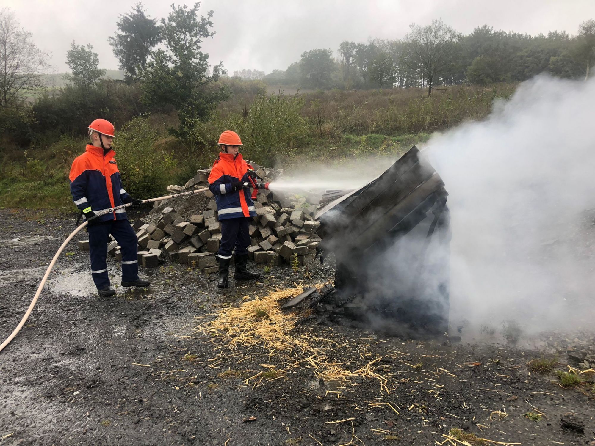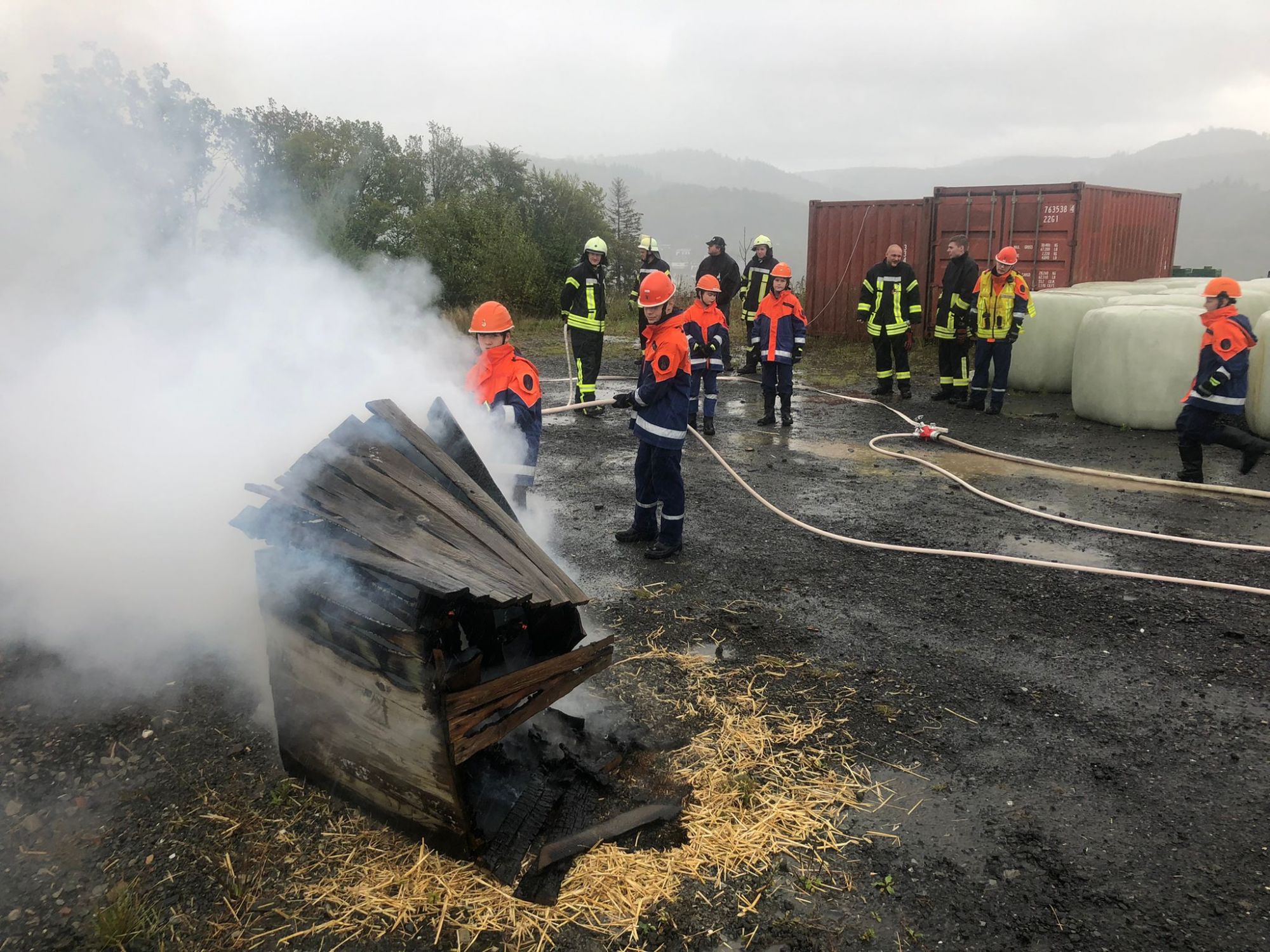 Gegen 14 Uhr dann erneut ein Einsatz. Mit drei Fahrzeugen wurde zu gemeldeten Brand in einem Gewerbebetrieb gefahren. Im Gewerbegebiet „Kleiner Öhler“ brannte beim ansässigen Dachdeckerbetrieb ein Holzstapel. Zwei Personen wurden auf dem Gelände vermisst. Es galt die verletzten Personen zu finden und aus ihrer misslichen Lage zu retten. Aufgrund der Lage war dies nicht so einfach. Dennoch meisterte die Jugend auch dies erfolgreich.