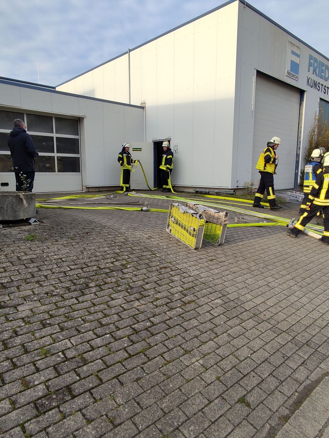 Durch die Kameraden David Babilon und Tobias Bornemann war ein interessantes Übungsszenario vorbereitet worden. In einer Produktionshalle der Firma Friedrichs Kunststoffteile war es zu einer Verpuffung gekommen. Bis zum Eintreffen der Feuerwehr konnten sich fast alle Mitarbeiter aus dem Gebäude retten. Vier Personen wurden in der weitläufigen Halle vermisst.