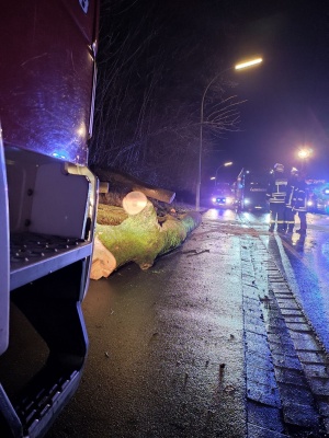 Baum auf Fahrbahn mit 2 beteiligten PKW, Baum mittels Motorsäge und Rüstwagen von der Fahrbahn beseitigt