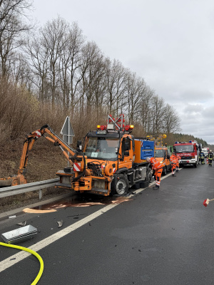 Verkehrsunfall mit Baustellenfahrzeug, auslaufender Kraftstoff größeren Umfangs |